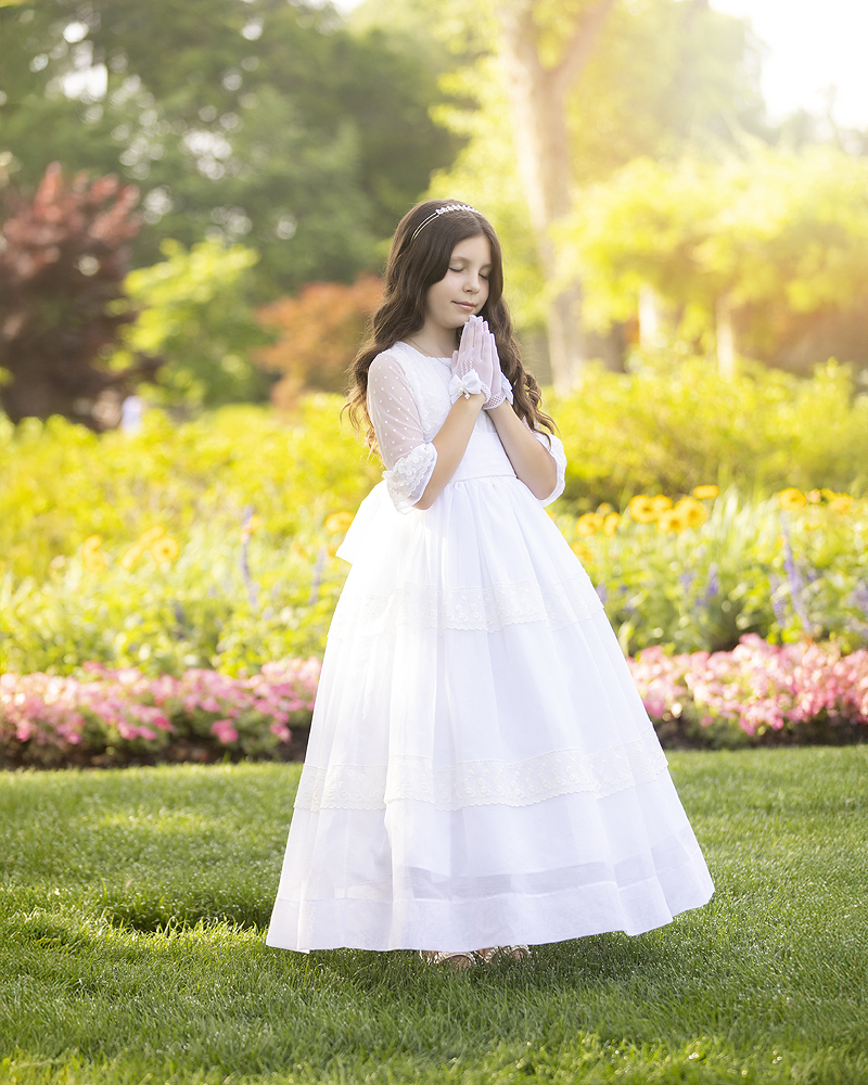 I always aim to bring out each child’s personality during these sessions. We giggled between shots, posed with the giant granny sculptures, admired the flowers, and made sure to include quiet moments that honored the meaning of the day. Her rosary, gifted by her grandmother, added such a sentimental touch to the portraits. It wasn’t just a prop—it was part of her story.