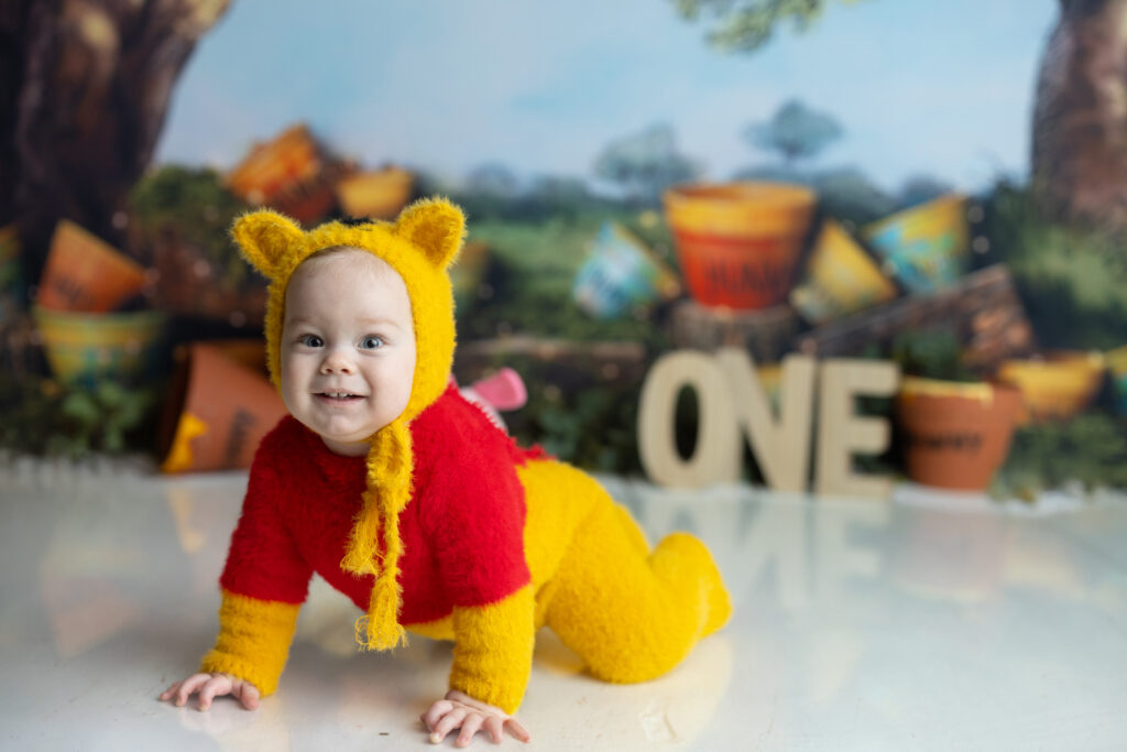 As a Dallas cake smash photographer, when people ask me what my favorite set is it is beyond a doubt this one! This Winnie the Pooh-themed cake smash session was nothing short of enchanting!