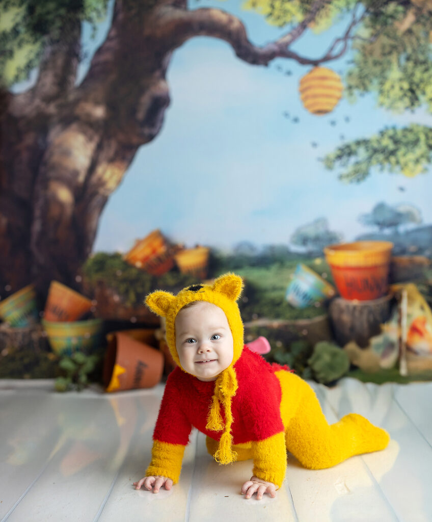 From the second our tiny birthday star showed up, the set was full of Hundred Acre Wood charm. Think soft honey tones, rustic wood touches, and cheerful pops of red and yellow. We even had a snuggly Pooh Bear plush keeping an eye on the action as our birthday babe giggled, crawled, and got right into that adorable honey pot cake.