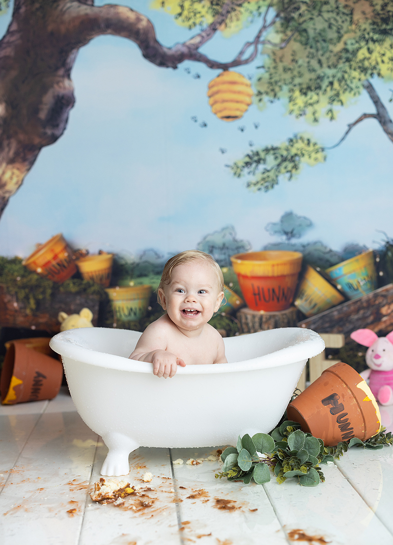 baby laughs in tub at cake smash photoshoot